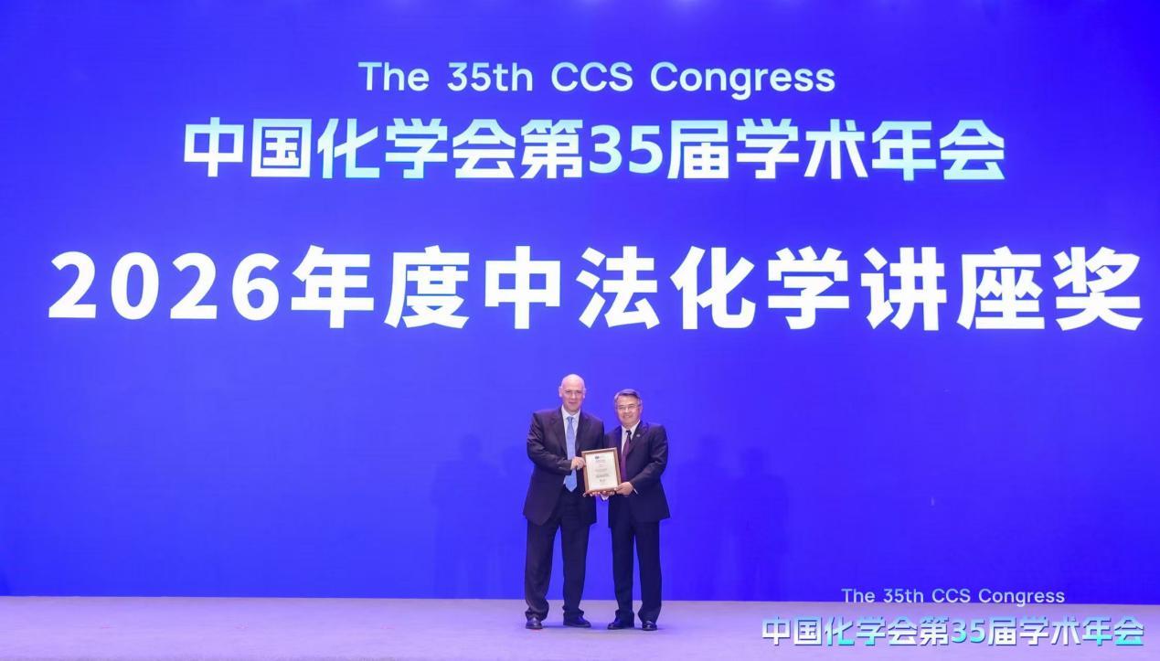 2026年4月11日,在中國化學(xué)會第35屆學(xué)術(shù)年會開幕式上,中國化學(xué)會副理事長帥志剛教授分別為2024年度中法化學(xué)講座獎獲得者、法國國家科學(xué)研究中心配位化學(xué)實驗室Bernard Meunier教授;2026年度中法化學(xué)講座獎獲得者、法國斯特拉斯堡大學(xué)Paolo Samorì教授頒獎。