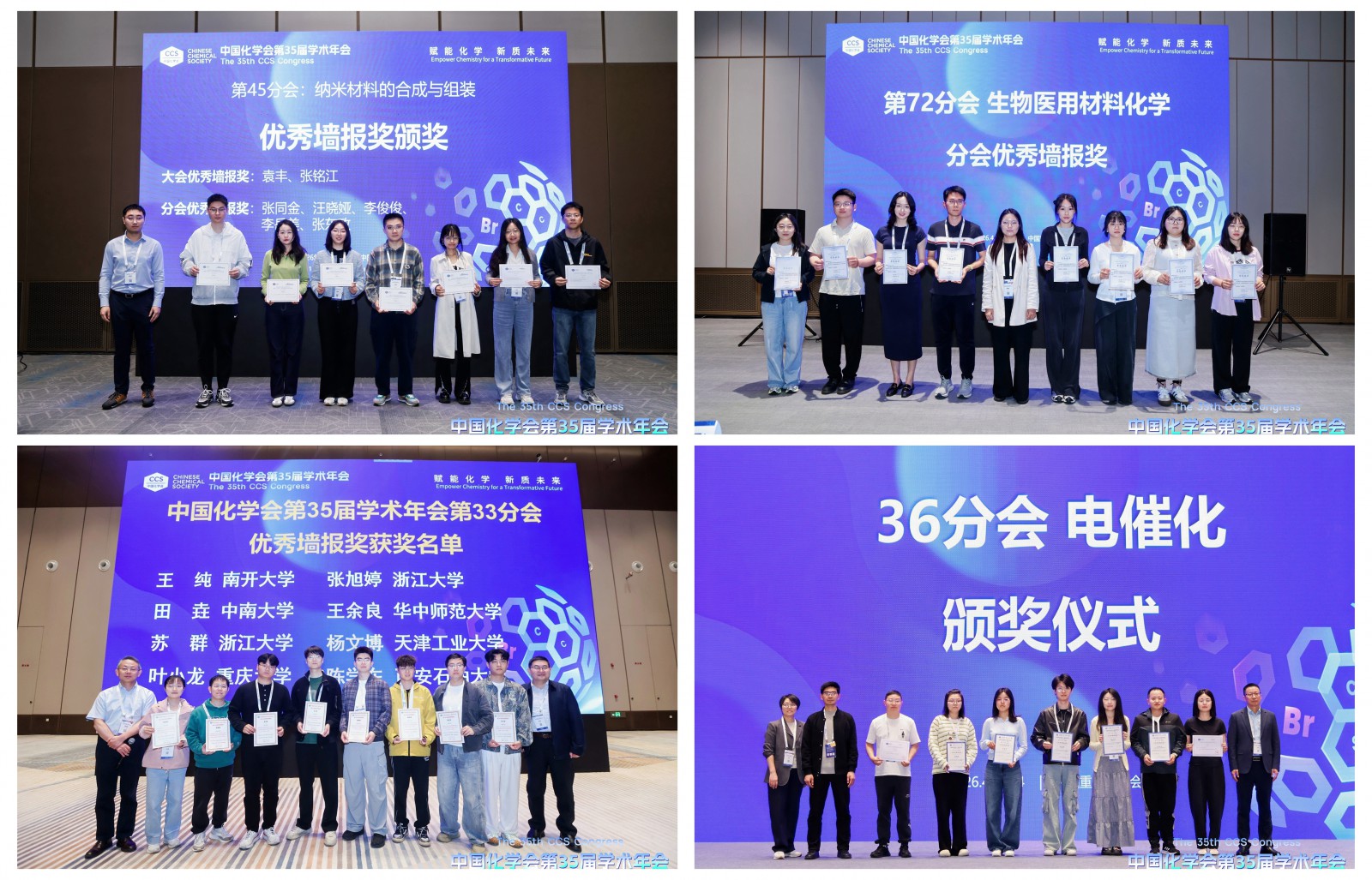 年會設(shè)立“中國化學(xué)會第35屆學(xué)術(shù)年會優(yōu)秀墻報”,以此鼓勵墻報交流,尤其是激發(fā)青年學(xué)生的積極性。年會獎勵委員會通過實地查閱,共評選出優(yōu)秀墻報154項。14日,各分會陸續(xù)舉辦了閉幕式,頒發(fā)了“優(yōu)秀墻報“證書。